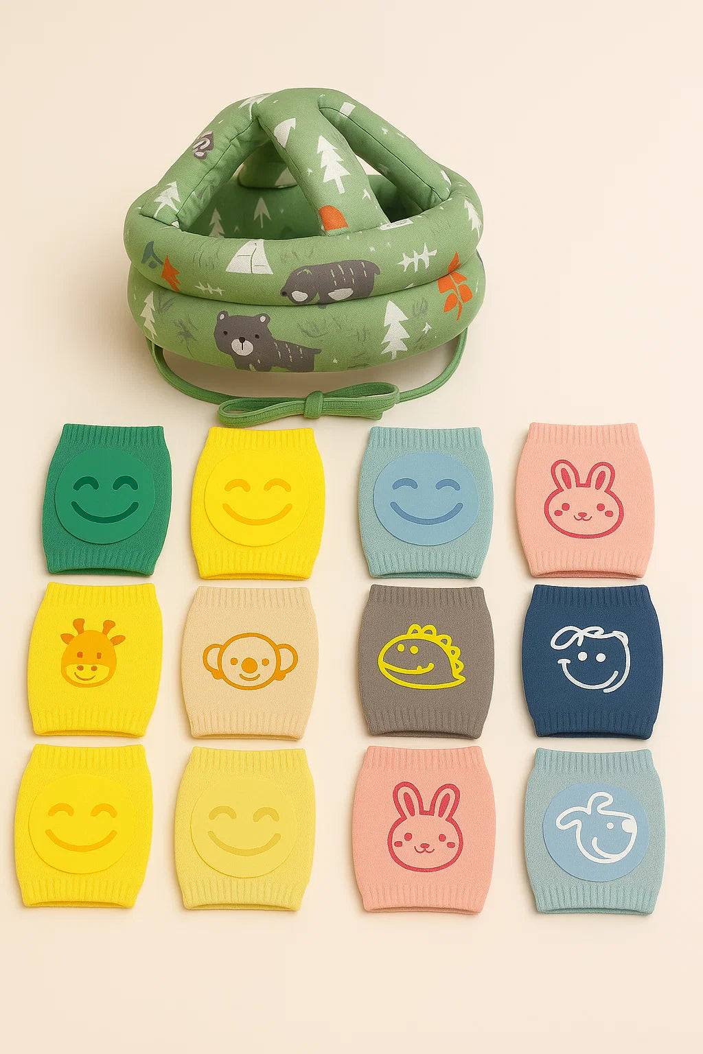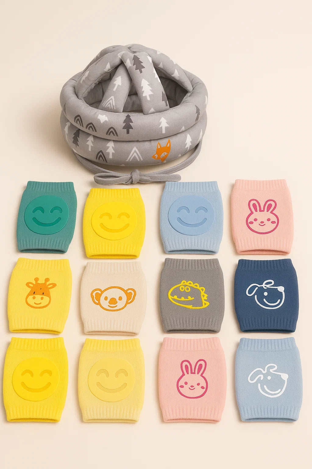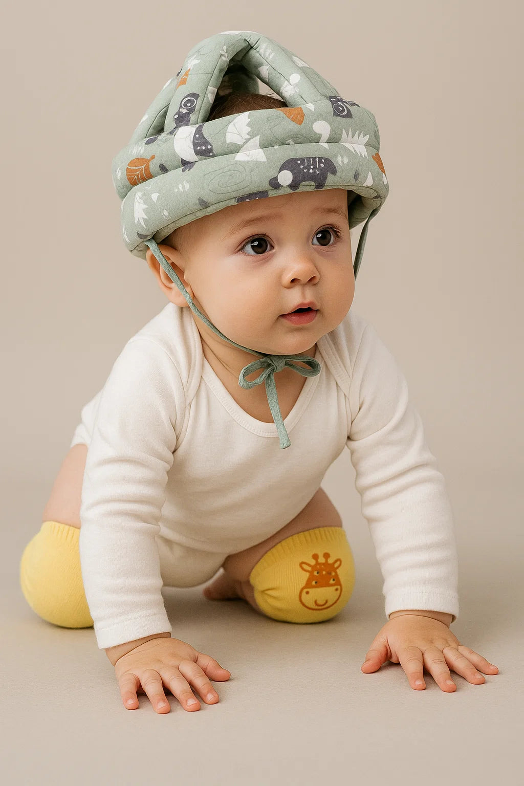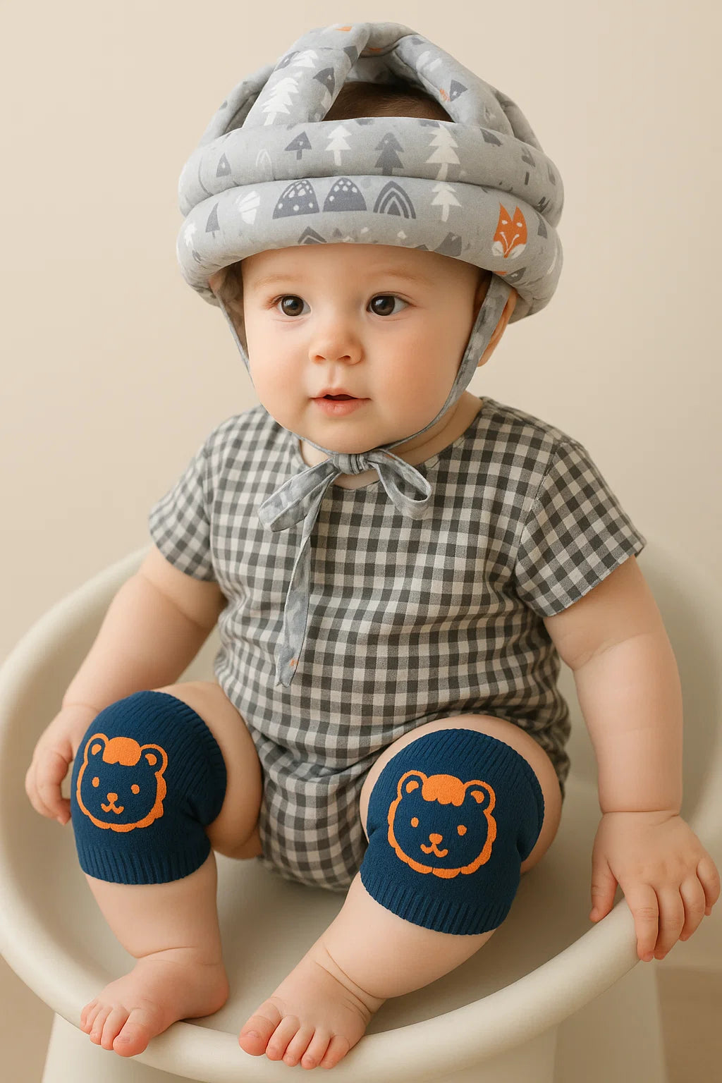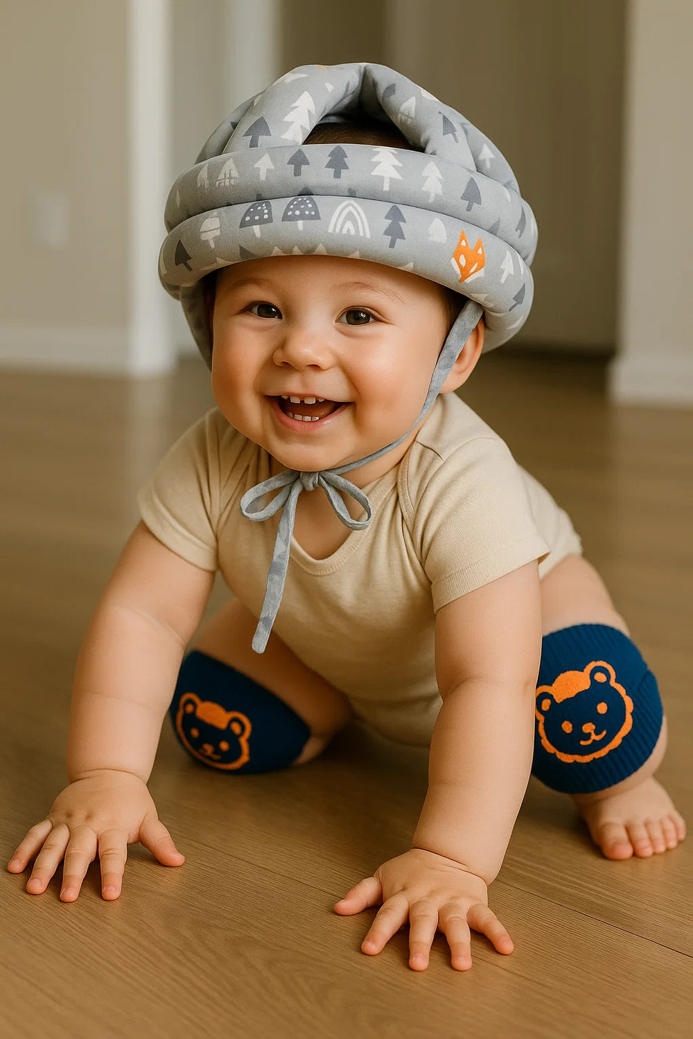 Simplemente coloca el casco sobre la cabeza de tu bebé y las rodilleras en sus rodillas. El diseño flexible y cómodo asegura que se ajusten bien sin incomodarlo, brindándole la protección que necesita mientras juega y explora.